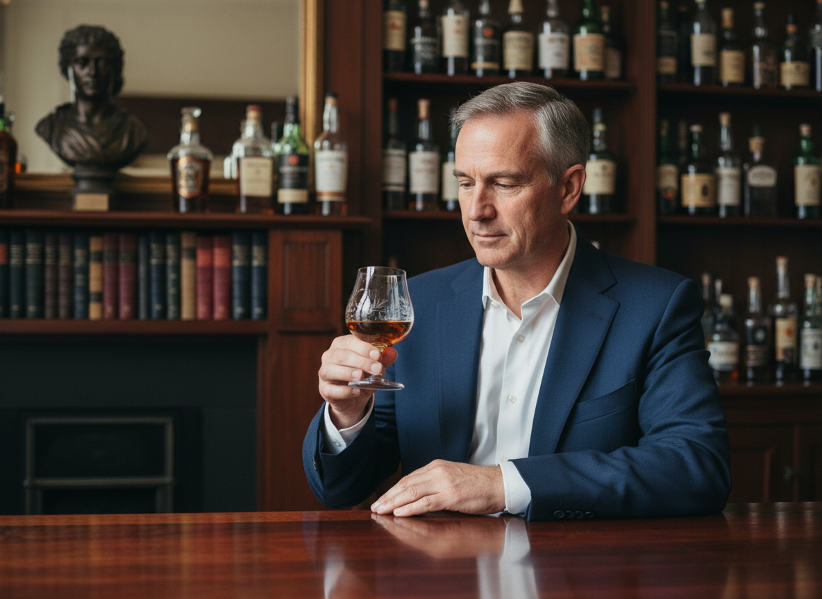 Homme d'âge moyen dégustant un vieux rhum dans un bar élégant